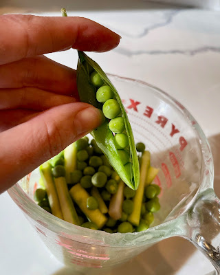 I realized, a bit late, that it would have taken less time to brown it if I'd sliced it. It would also have been faster if I hadn't opted to use asparagus and fresh English peas as my vegetables, because it takes time to peel the former and shell the latter.